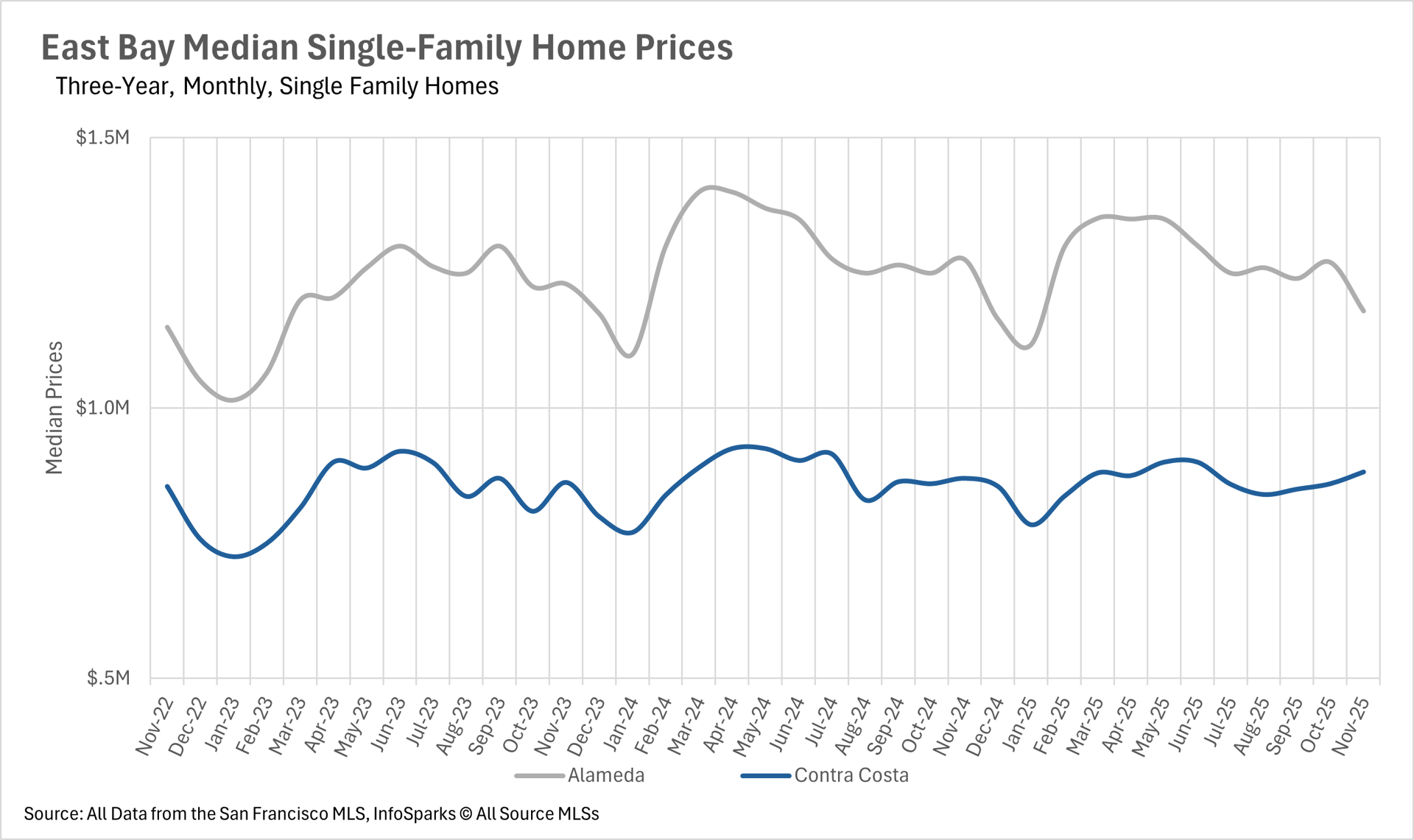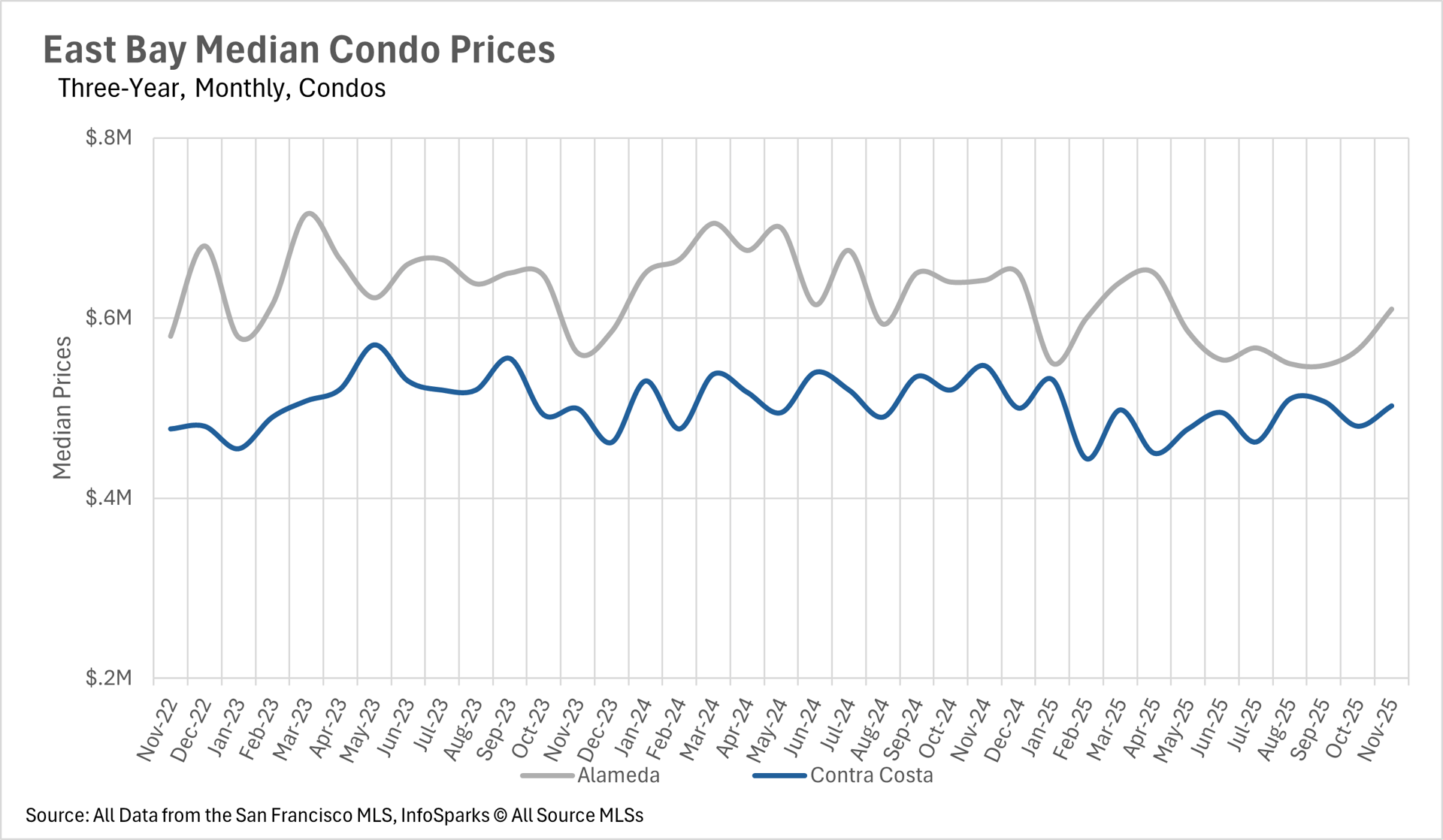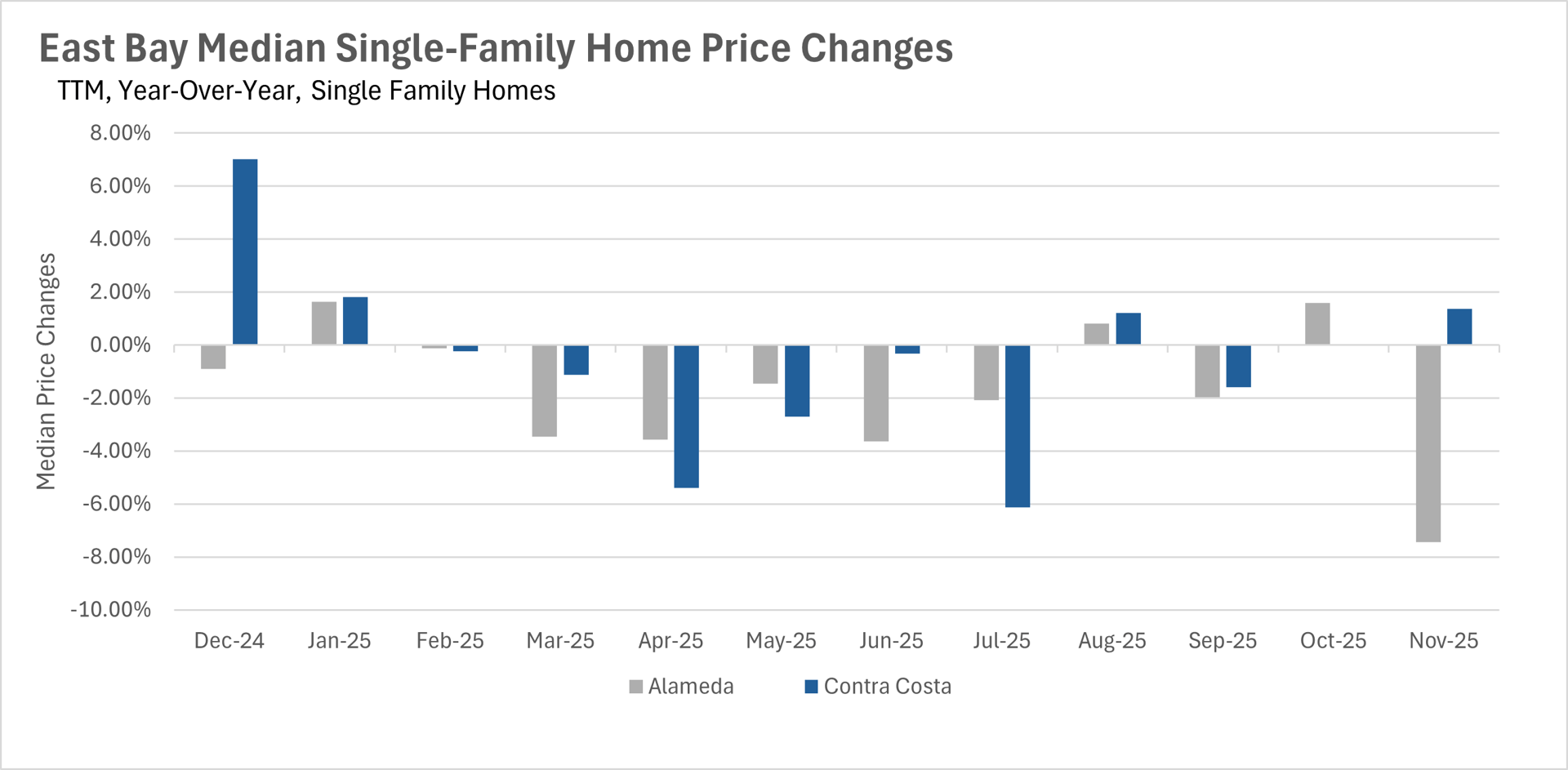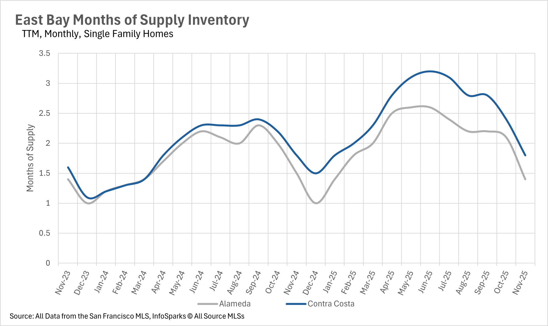 In the month of November, we saw very little movement on a year-over-year basis in terms of months of supply on the market. There were 1.4 and 1.8 months of single-family inventory on the market in Alameda and Contra Costa Counties, respectively, putting it firmly into sellers market territory. Whereas the condo market is a buyers market, as there were 3.6 and 3.1 months of inventory on the market in Alameda and Contra Costa Counties, respectively.
