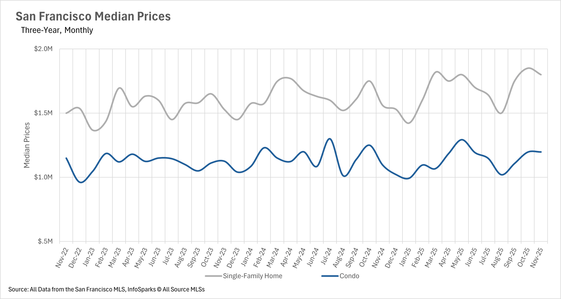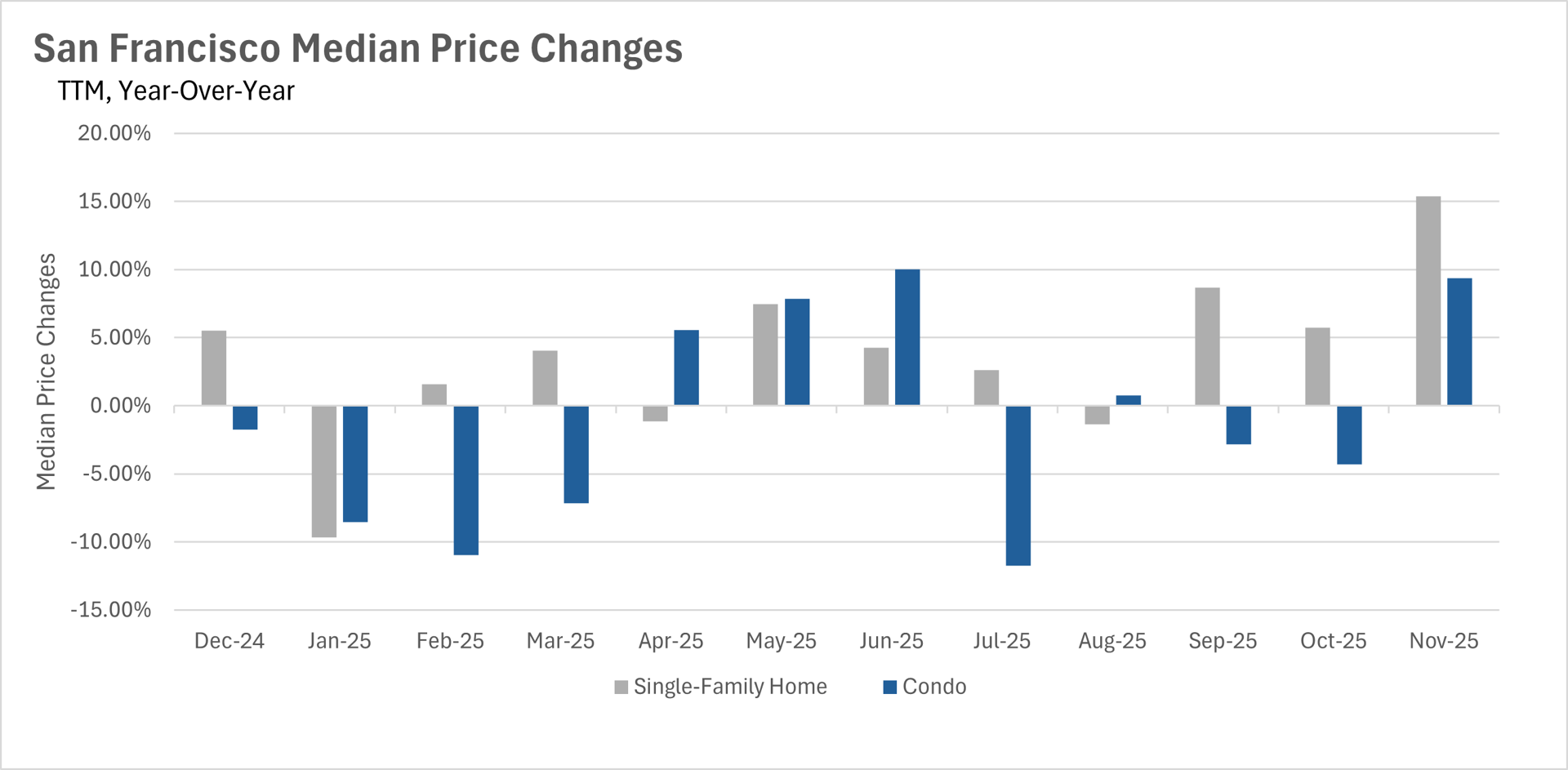 Median sale prices skyrocketed in San Francisco on a year-over-year basis in November.