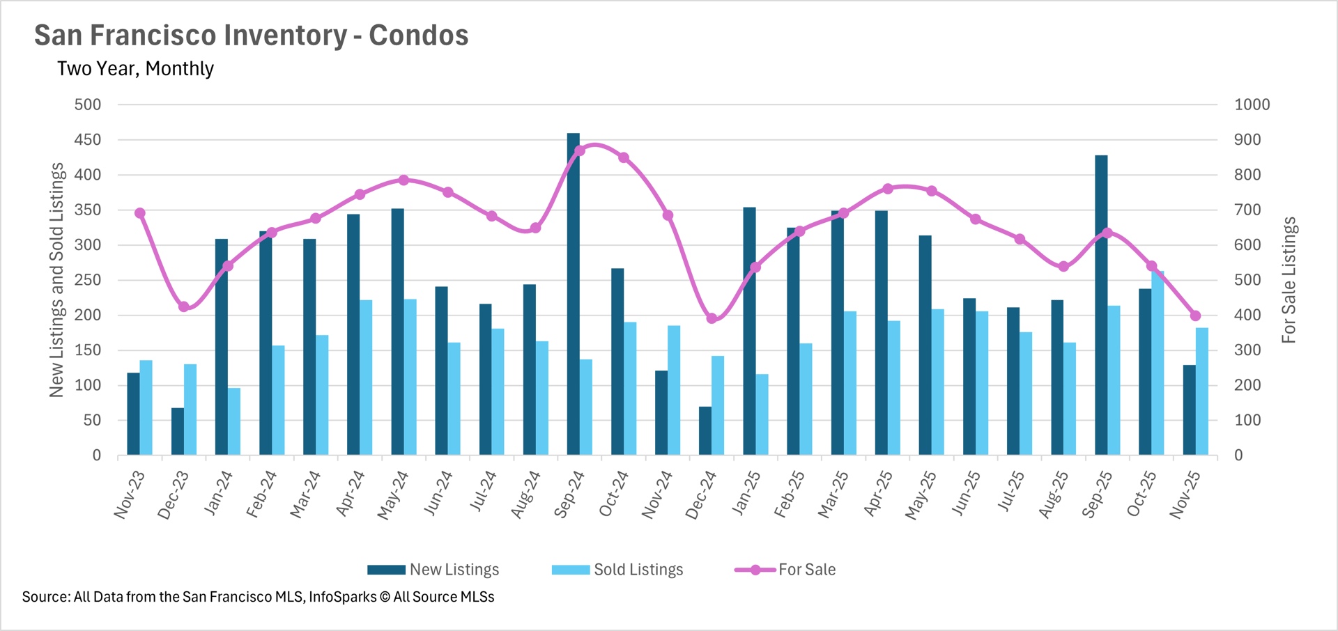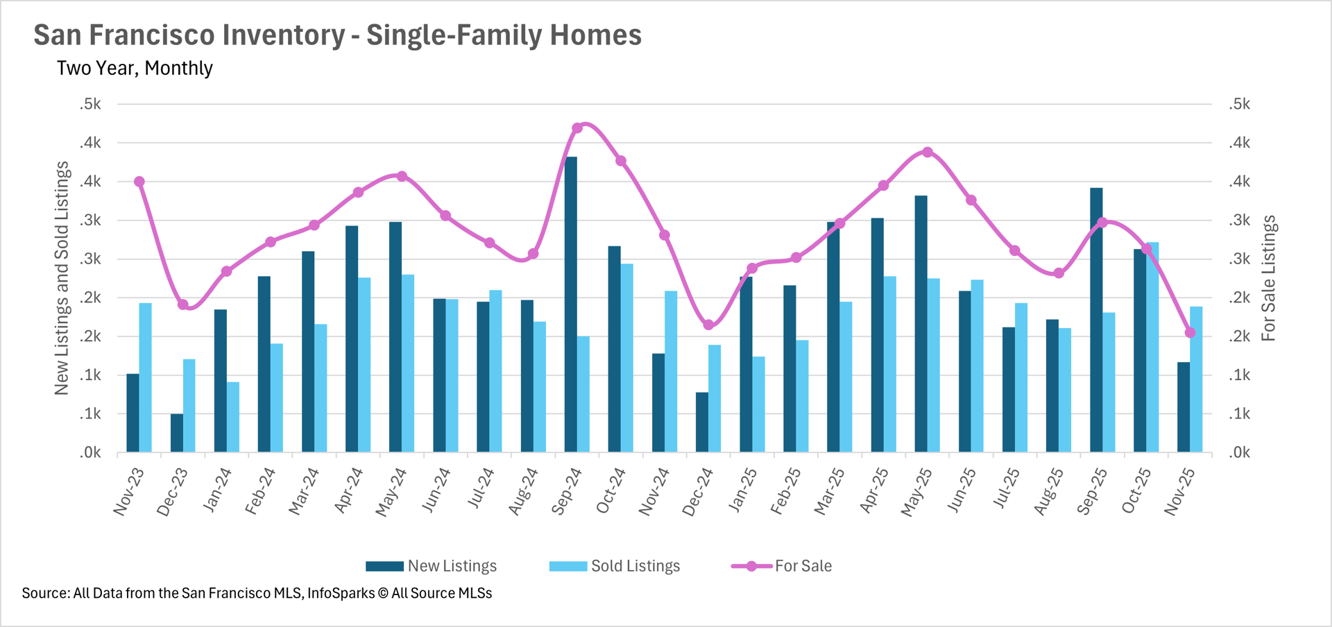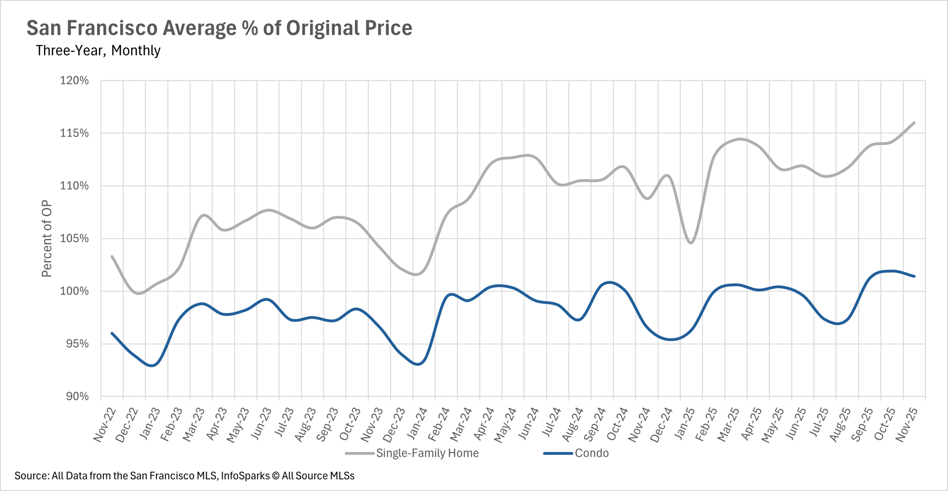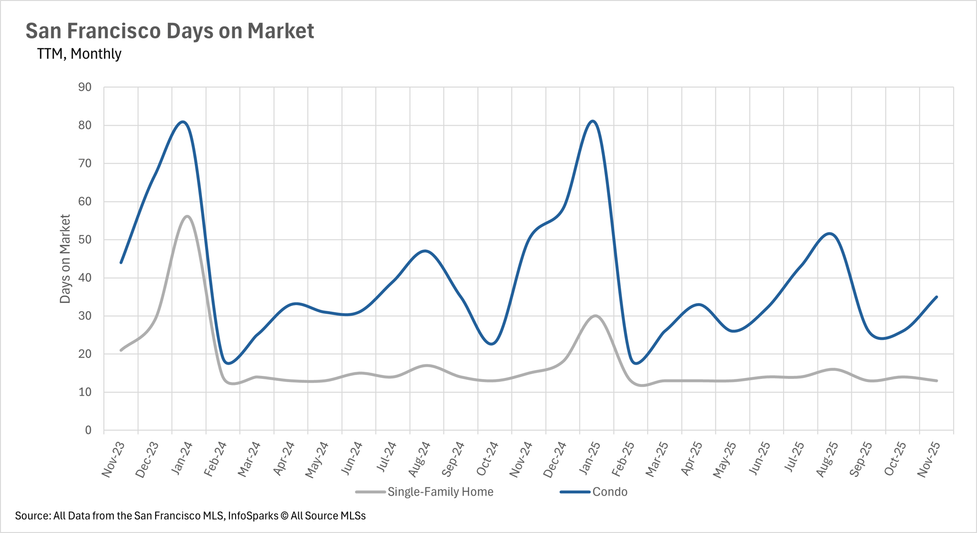 Since inventories are declining steadily over time, listings are spending less and less time on the market. The average single-family home in San Francisco is selling in just 13 days. This represents a 13.33% year-over-year decrease. Likewise, condos are moving incredibly quickly as well, with the average condo selling in just 35 days, representing a 30% year-over-year decline. Unfortunately, this means that buyers don’t have time to ponder an offer before they make it, and this issue won’t resolve itself until the market is able to absorb some inventory!