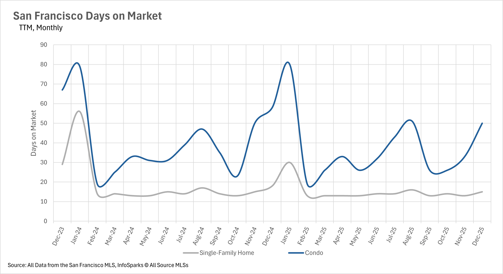 With just 0.5 months of single-family home inventory and 1.2 months of condo inventory on the market, San Francisco has become a deeply entrenched seller's market across all property types. These are some of the lowest MSI figures we've seen in years, and there is no indication that conditions will ease for buyers any time soon. Until significant new inventory enters the market, sellers will continue to hold all the cards in San Francisco.