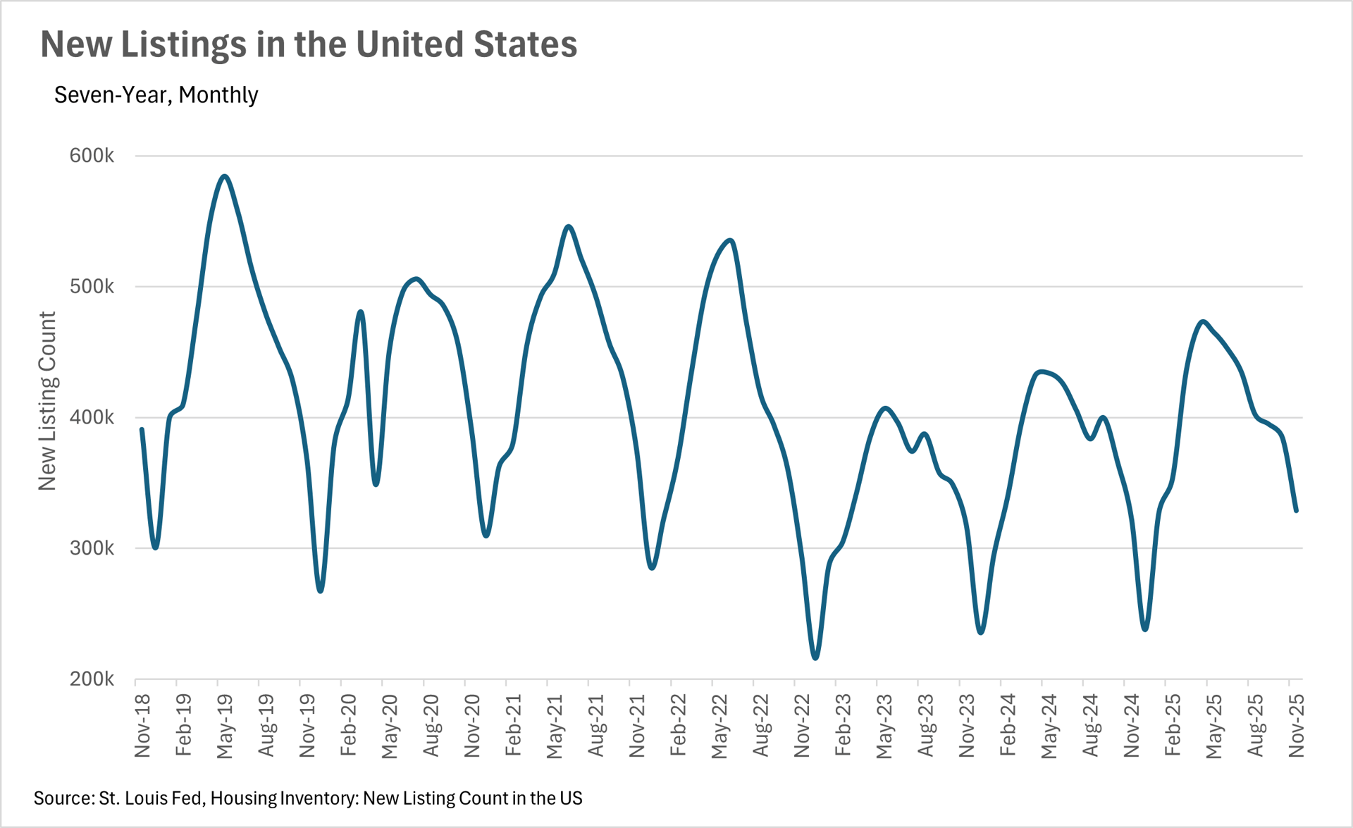 With the median monthly P&I payment hitting $2,056 in November, that marks a considerable decrease from the $2,311 maximum that we hit earlier in the year. As you might have guessed, this is largely due to interest rates declining, as the Federal Reserve continues its rate cutting cycle. In November of 2024, interest rates were at 6.79%, compared to 6.22% in November of 2025. This represents an 8.39% decrease in interest rates on a year-over-year basis, while the median sale price of a home in the US actually increased by 1.19% during that same period of time. As interest rates slowly creep down, we will likely see home values continue to increase, as the deciding factor for most people is not the total purchase amount, but instead the monthly payment that they can afford.
