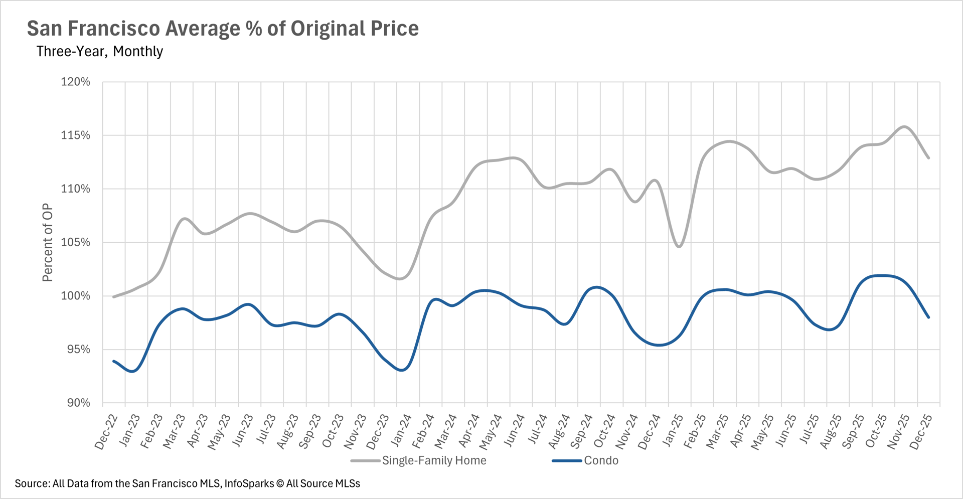 The San Francisco housing market closed out 2025 with impressive year-over-year gains in median sale prices. Single-family homes saw an 8.63% increase, with the median home selling for $1,662,000. Condos also performed well, with the median sale price increasing by 5.21% to $1,075,000. Single-family homes continue to command significant premiums, with the average home selling for nearly 13% over the original asking price. Meanwhile, condos are selling right around their asking prices at 98% of list price.
