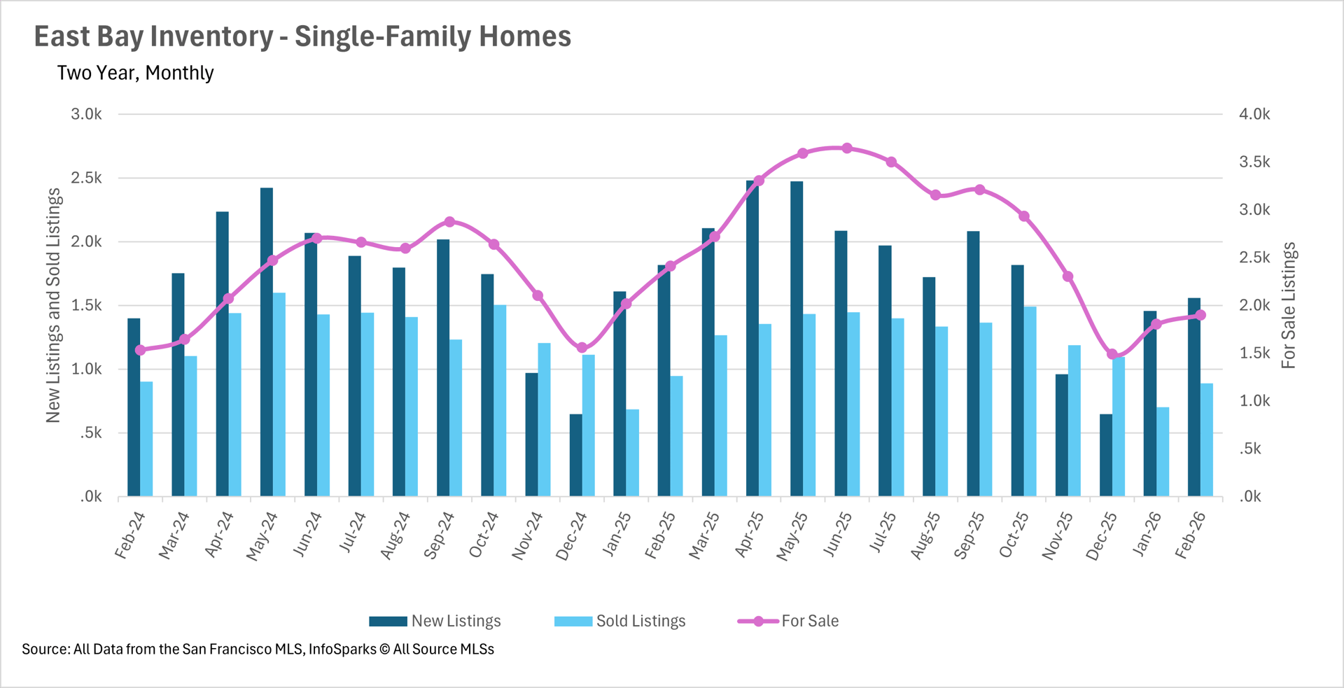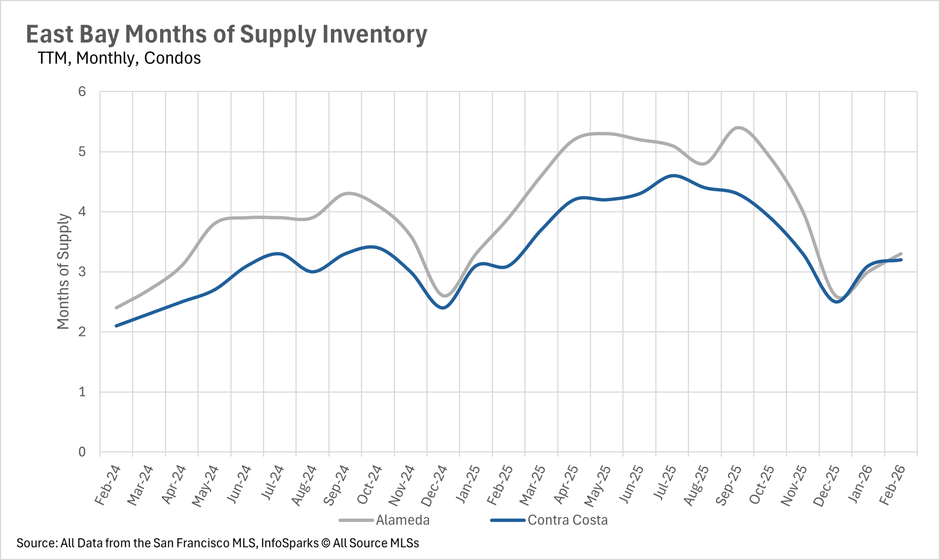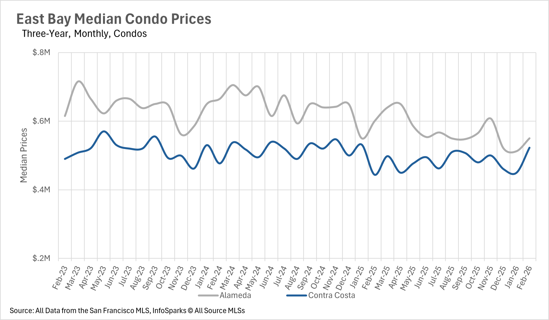 As we move into the spring selling season, inventory levels in the East Bay remain well below where they were a year ago. Single-family home inventory stood at just 1,898 units in February, representing a 21.24% decline on a year-over-year basis. The condo market saw a similar trend, with inventory down 14.40% to just 731 units. This persistent lack of inventory continues to be a defining feature of the East Bay market and is likely contributing to the relative stability in single-family home prices. As we move deeper into spring, we'll be watching closely to see whether new listings can keep pace with buyer demand.