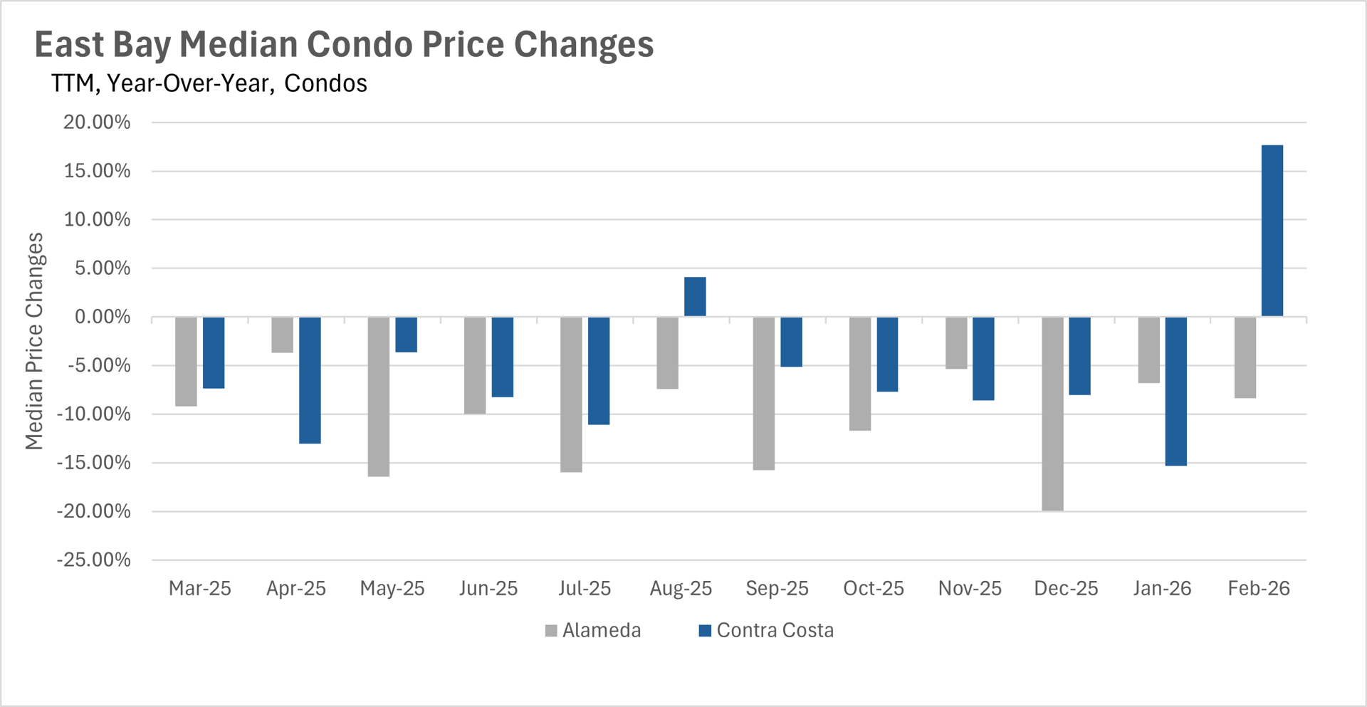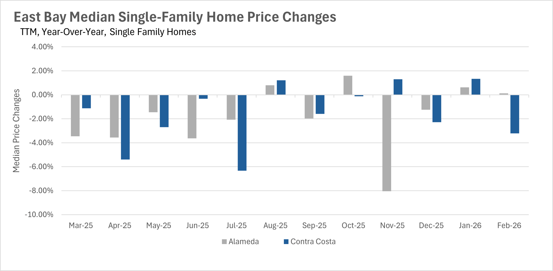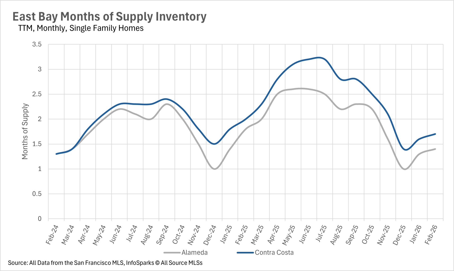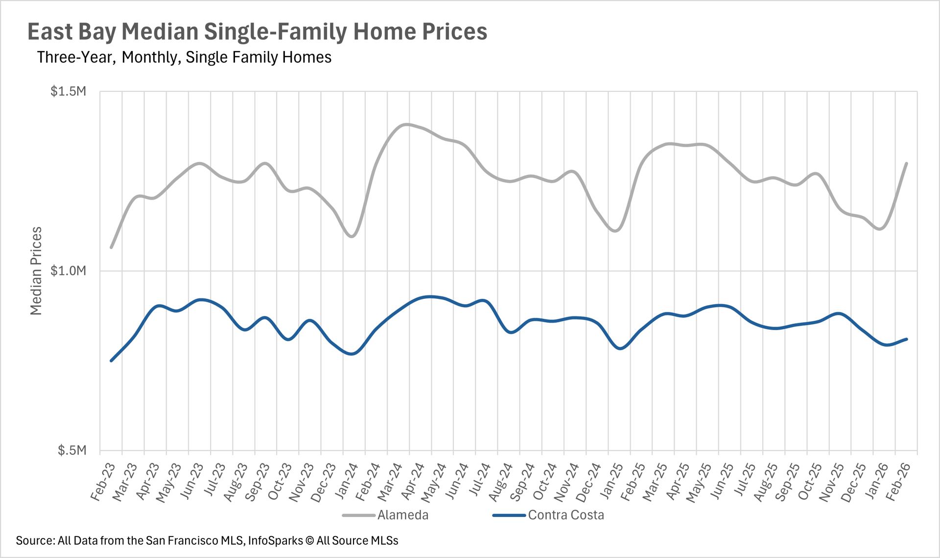 As we move into the spring selling season, inventory levels in the East Bay remain well below where they were a year ago. Single-family home inventory stood at just 1,898 units in February, representing a 21.24% decline on a year-over-year basis. The condo market saw a similar trend, with inventory down 14.40% to just 731 units. This persistent lack of inventory continues to be a defining feature of the East Bay market and is likely contributing to the relative stability in single-family home prices. As we move deeper into spring, we'll be watching closely to see whether new listings can keep pace with buyer demand.