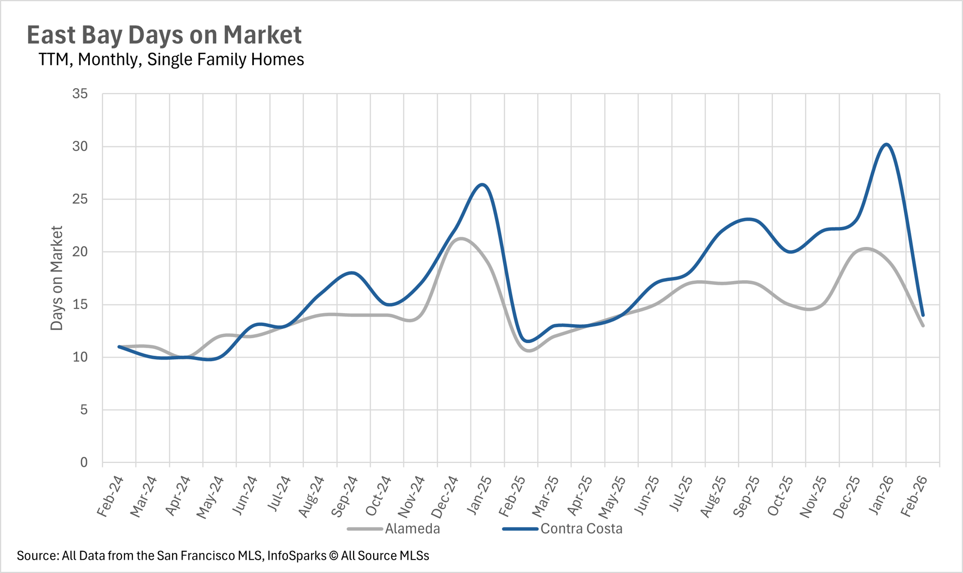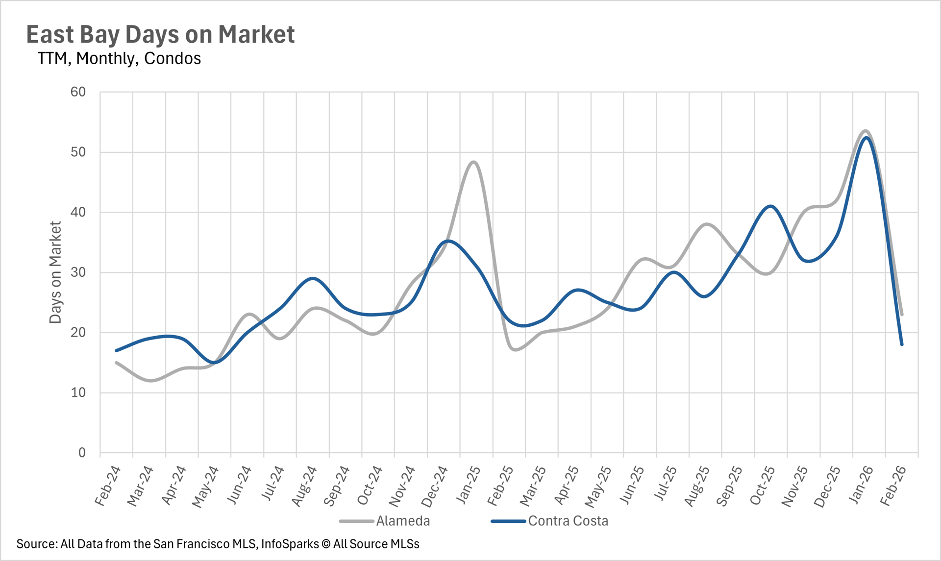 The pace of sales picked up considerably in February, with single-family homes selling remarkably quickly across both counties. The average single-family home in Alameda County sold in just 13 days, while homes in Contra Costa County sold in just 14 days. While these figures represent year-over-year increases of 18.18% and 16.67% respectively, listings are still moving at a very brisk pace by historical standards. The condo market also saw improved velocity, with the average condo in Alameda County selling in 23 days and Contra Costa County condos selling in just 18 days. This represents a sharp month-over-month improvement, as buyers appear to be taking advantage of the spring selling season.