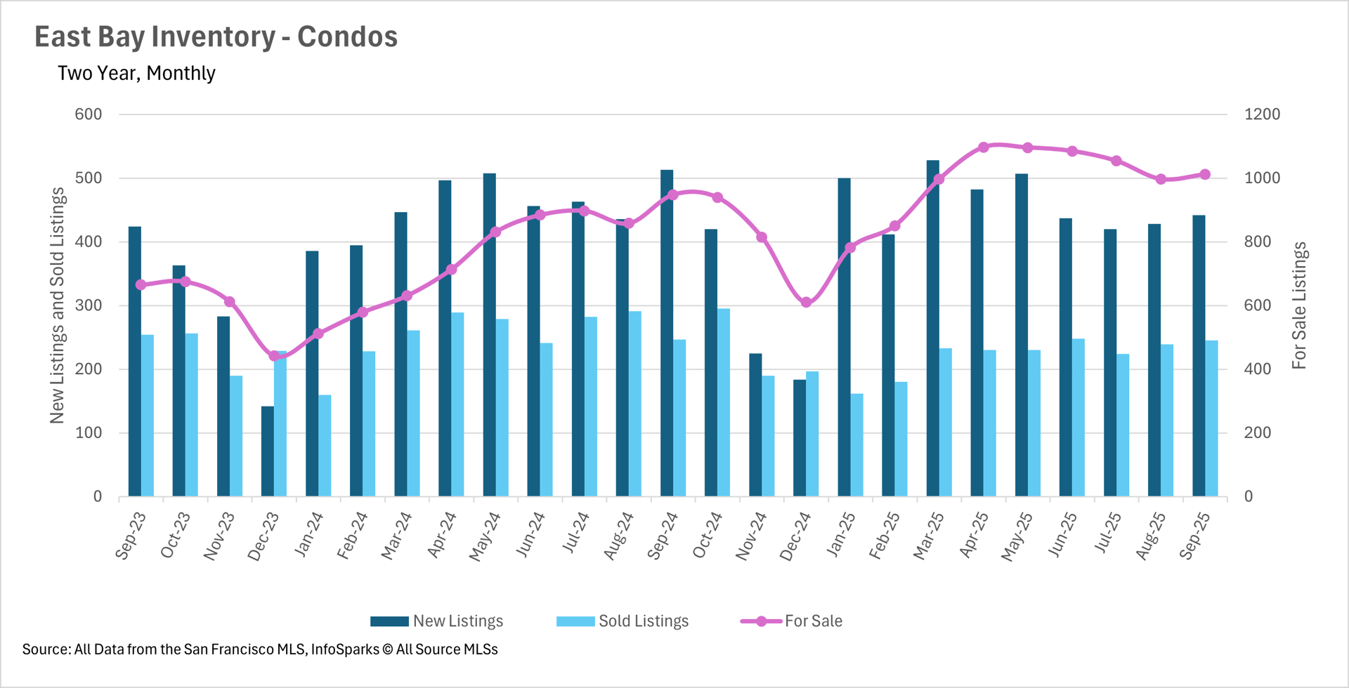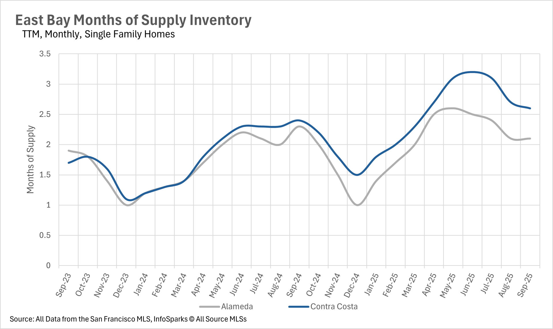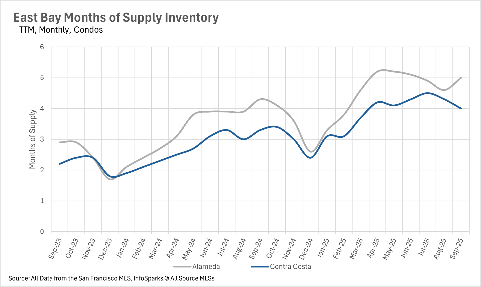 Over the course of the past month, there hasn’t been much of a change in terms of the state of the overall markets in the East Bay. Single-family home markets remain heavily within sellers' territory, with just 2.1 months of inventory on the market in Alameda County and 2.6 months in Contra Costa County. Whereas the condo market tells a much different story, with 5 months of inventory on the market in Alameda County and 4 months in Contra Costa County, making the condo market a buyer-dominated market.