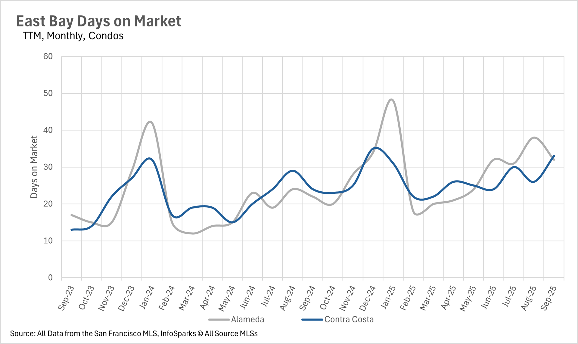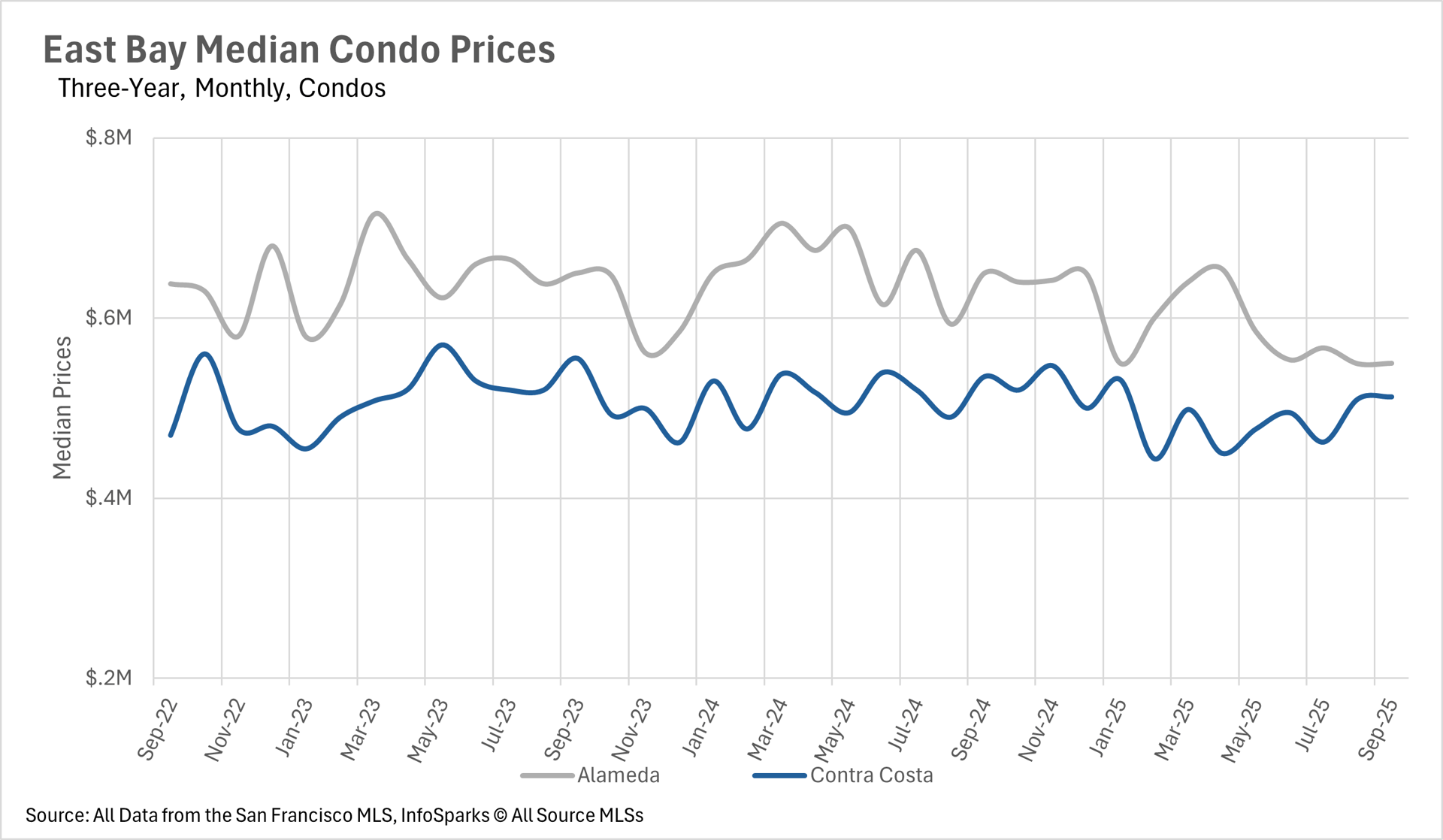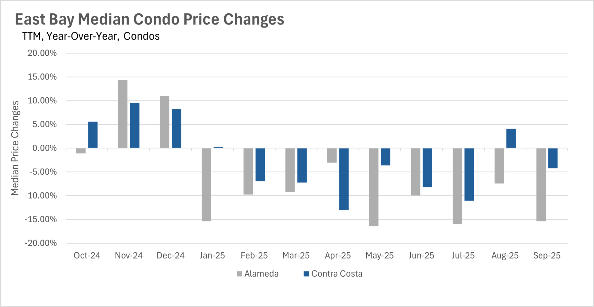 In the month of August, the East Bay bucked the trend of continual year-over-year declines in price. However, in September, this trend returned, as single-family median sale prices dipped by 1.59% in Contra Costa County and 1.98% in Alameda County. However, it’s important to note that listings in both of these areas look to be selling within the “band” of prices that they have historically sold at over the course of the past few years, so there’s no cause for concern yet! In the condo market, we did see some larger downward swings, with the median sale price for a condo in Contra Costa County declining by 4.21% on a year-over-year basis.