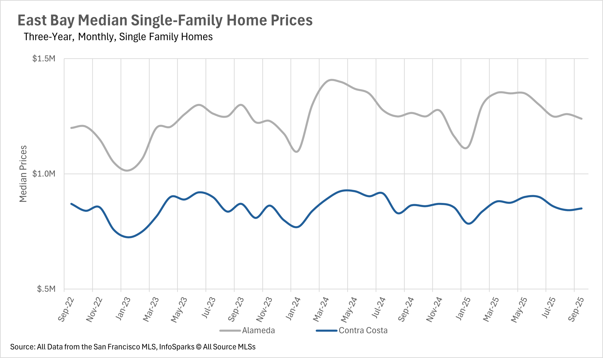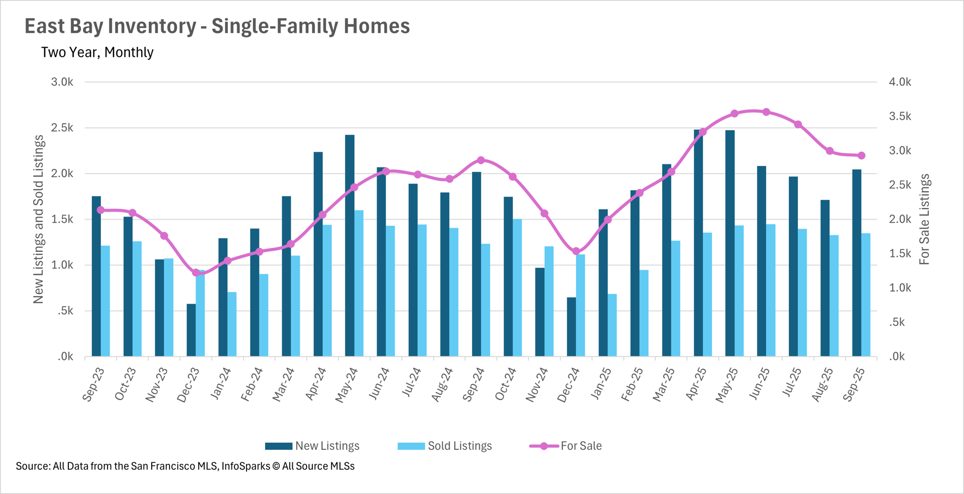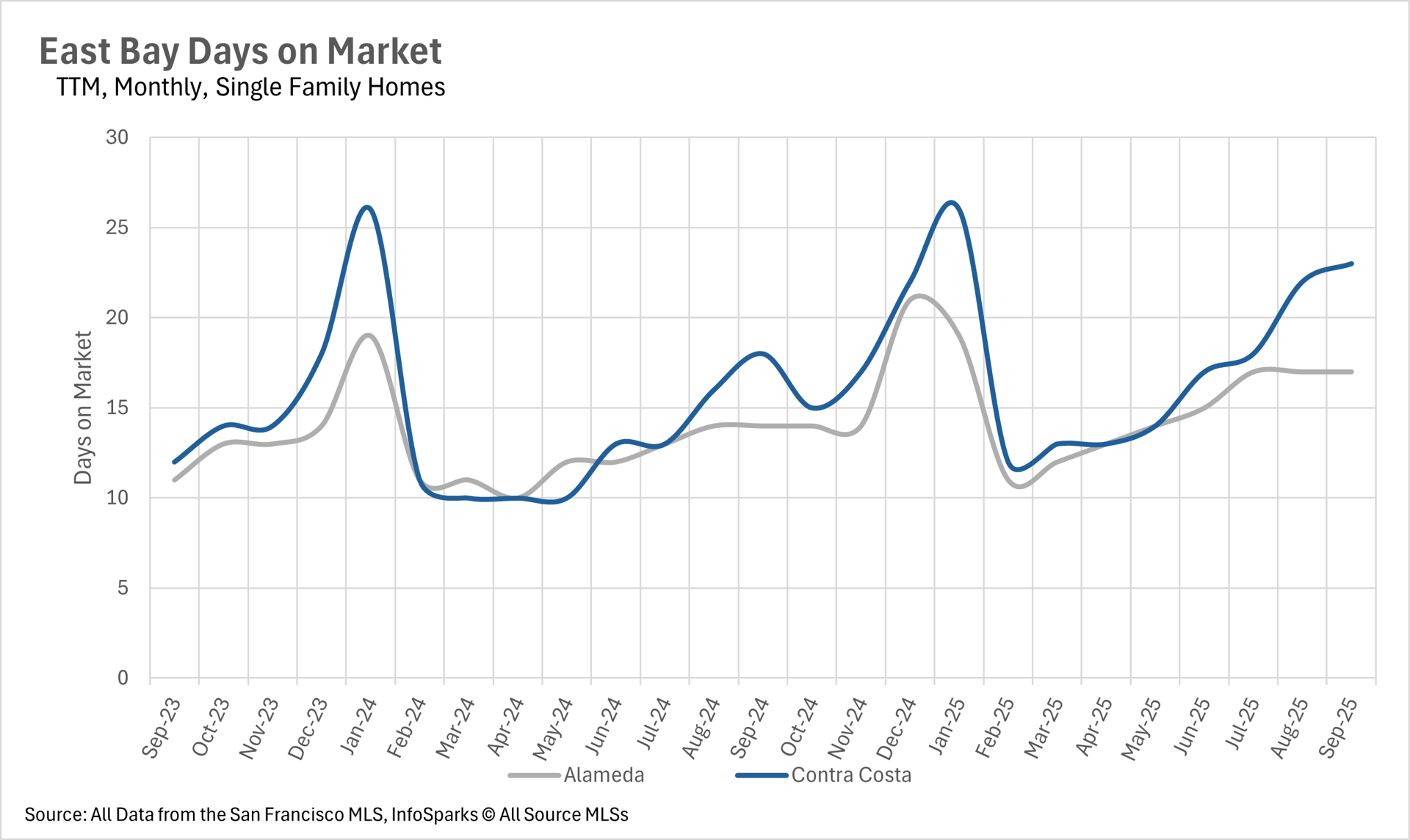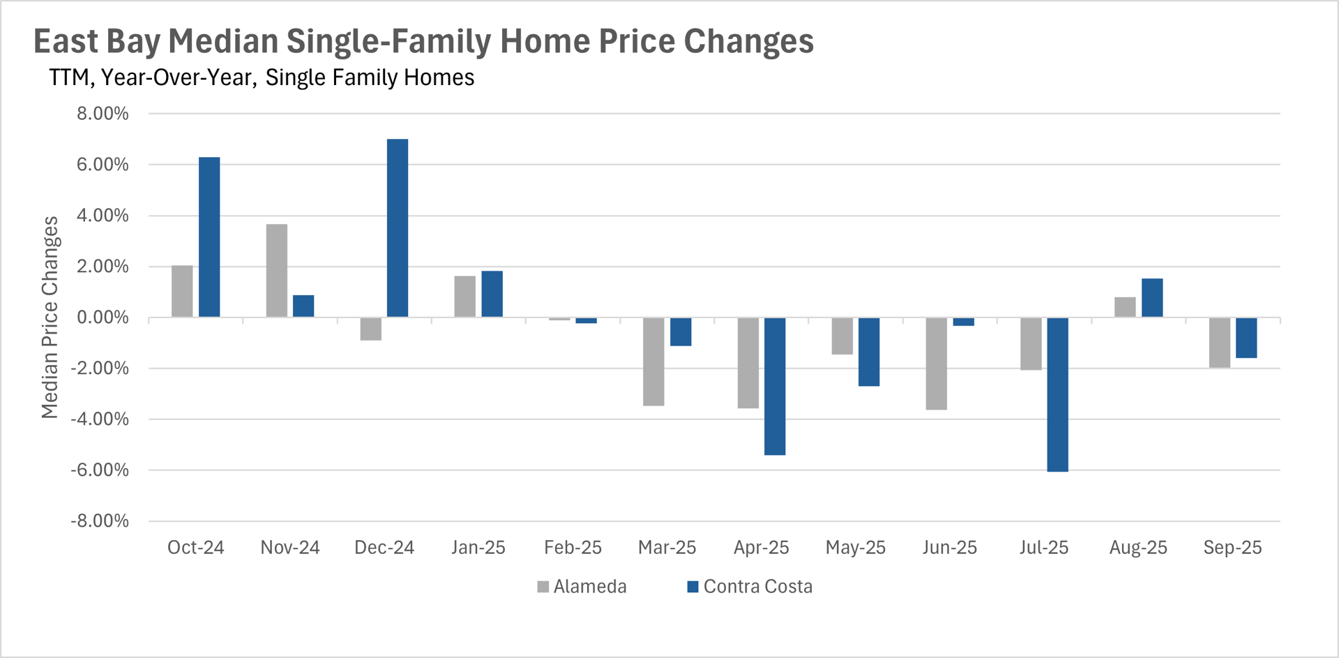 In the month of August, the East Bay bucked the trend of continual year-over-year declines in price. However, in September, this trend returned, as single-family median sale prices dipped by 1.59% in Contra Costa County and 1.98% in Alameda County. However, it’s important to note that listings in both of these areas look to be selling within the “band” of prices that they have historically sold at over the course of the past few years, so there’s no cause for concern yet! In the condo market, we did see some larger downward swings, with the median sale price for a condo in Contra Costa County declining by 4.21% on a year-over-year basis.